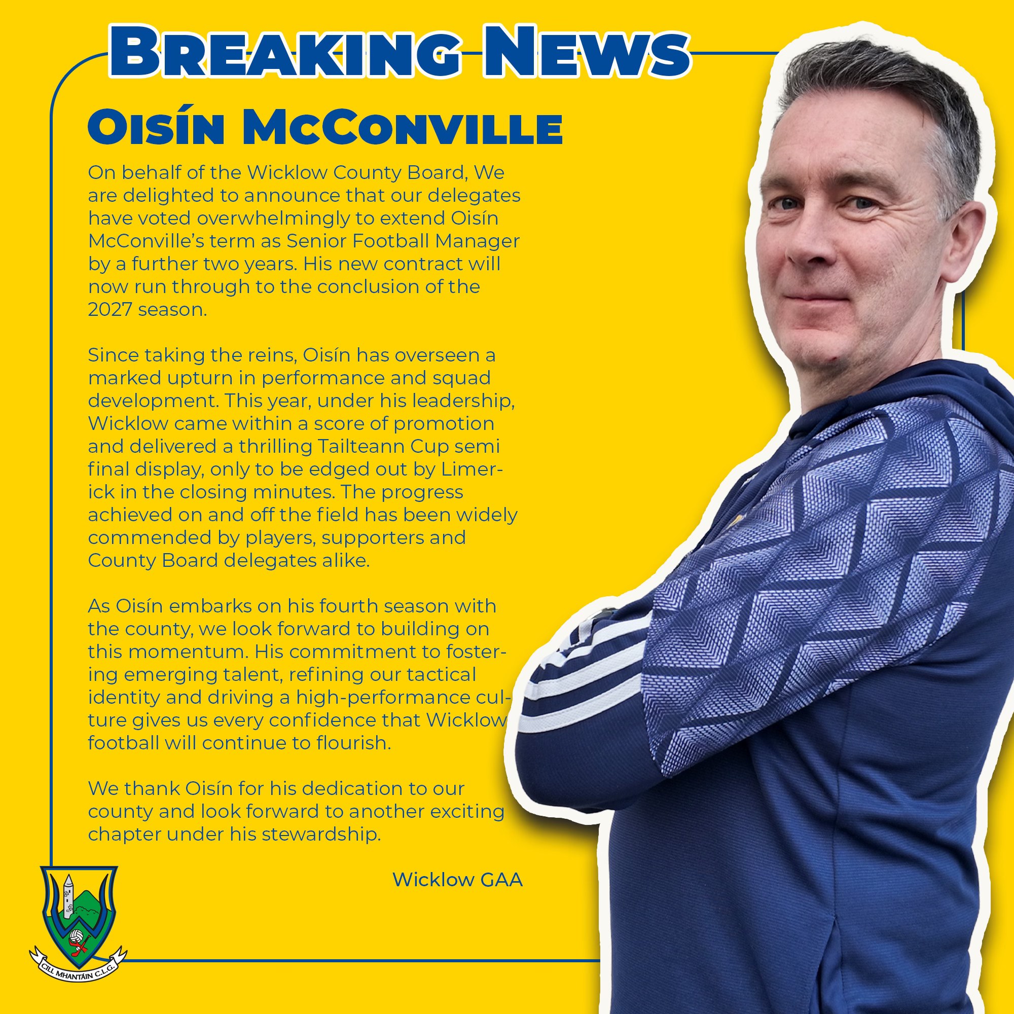 On behalf of the Wicklow County Board, We are delighted to announce that our delegates have voted overwhelmingly to extend Oisín McConville’s term as Senior Football Manager by a further two years. His new contract will now run through to the conclusion of the 2027 season.