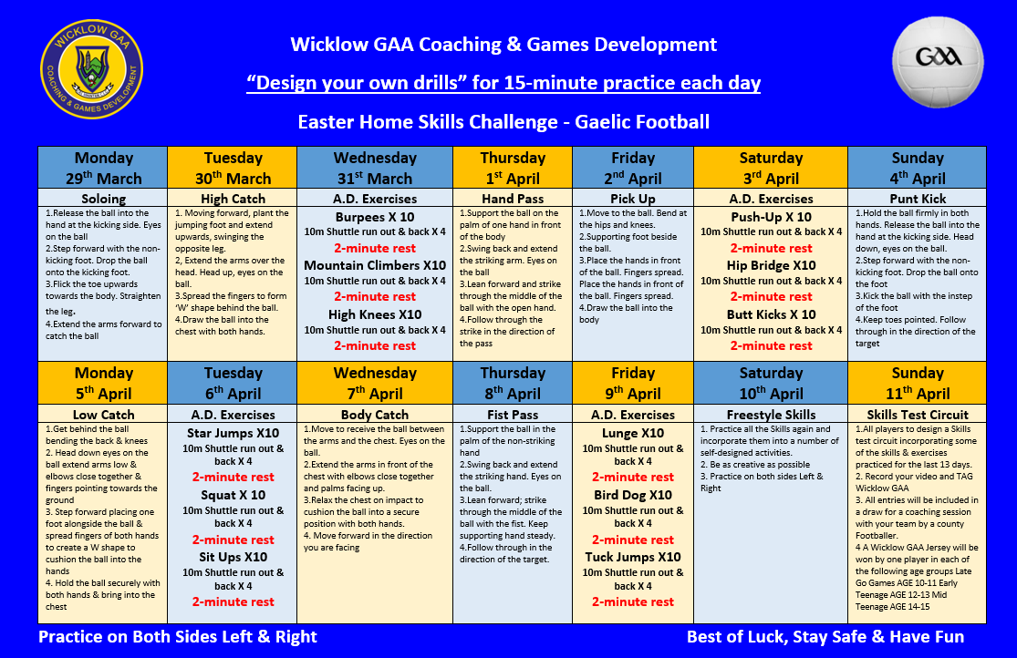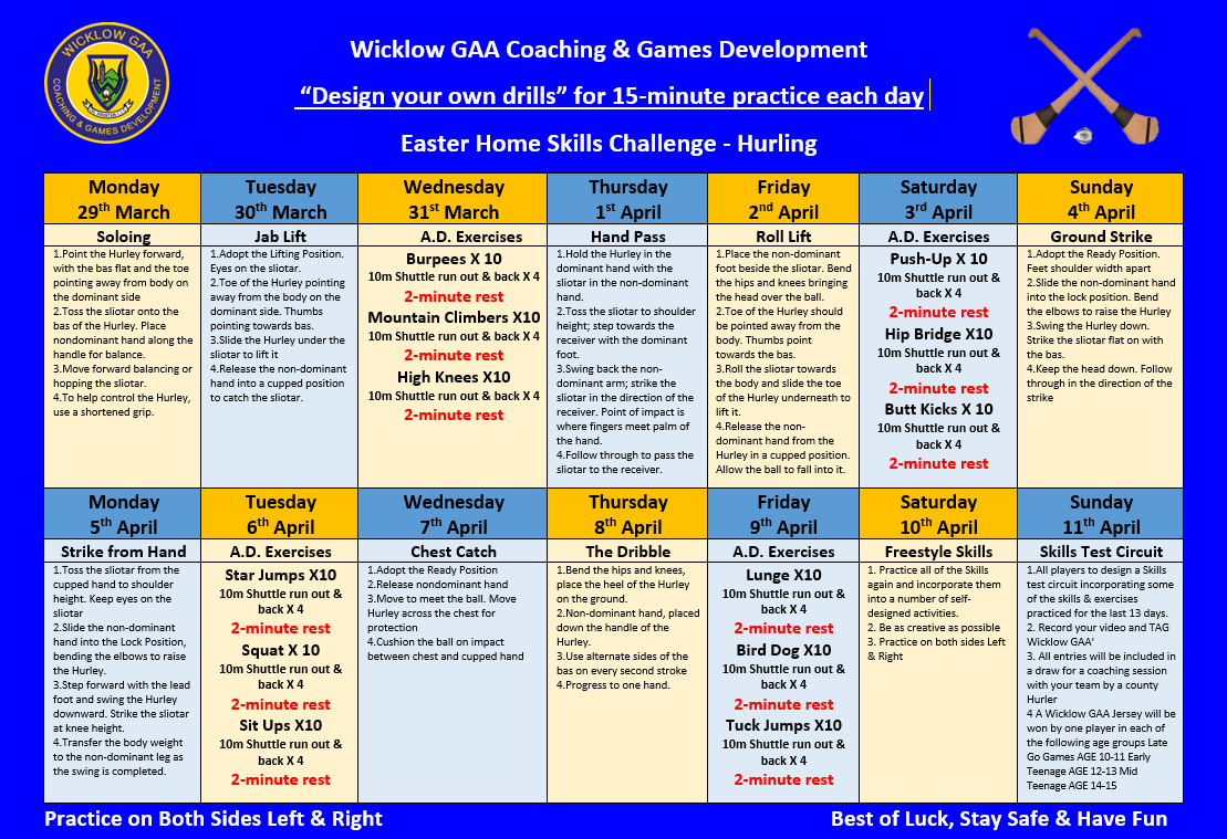 and be in with a chance of winning one of 6 Wicklow GAA County Jerseys. All entries will be entered into a draw for the Opportunity for your team to be coached by a County Hurler or Footballer .