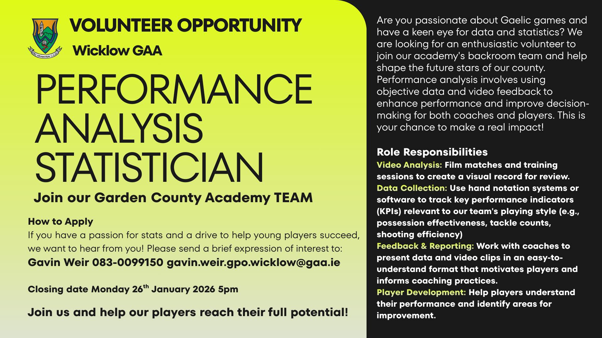 Our Garden County Academy are looking for volunteer Performance Analysis/Statistician to work with our squads.
