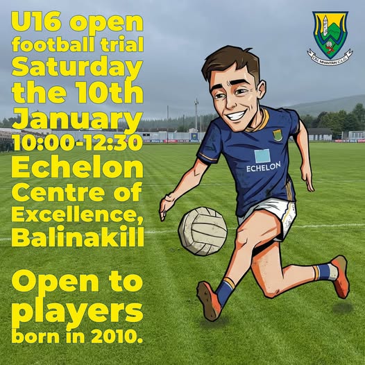 Wicklow GAA invites all eligible players to attend U16 Open Football Trials on Saturday, 10th January, from 10:00am to 12:30pm at the Echelon Centre of Excellence, Balinakill.